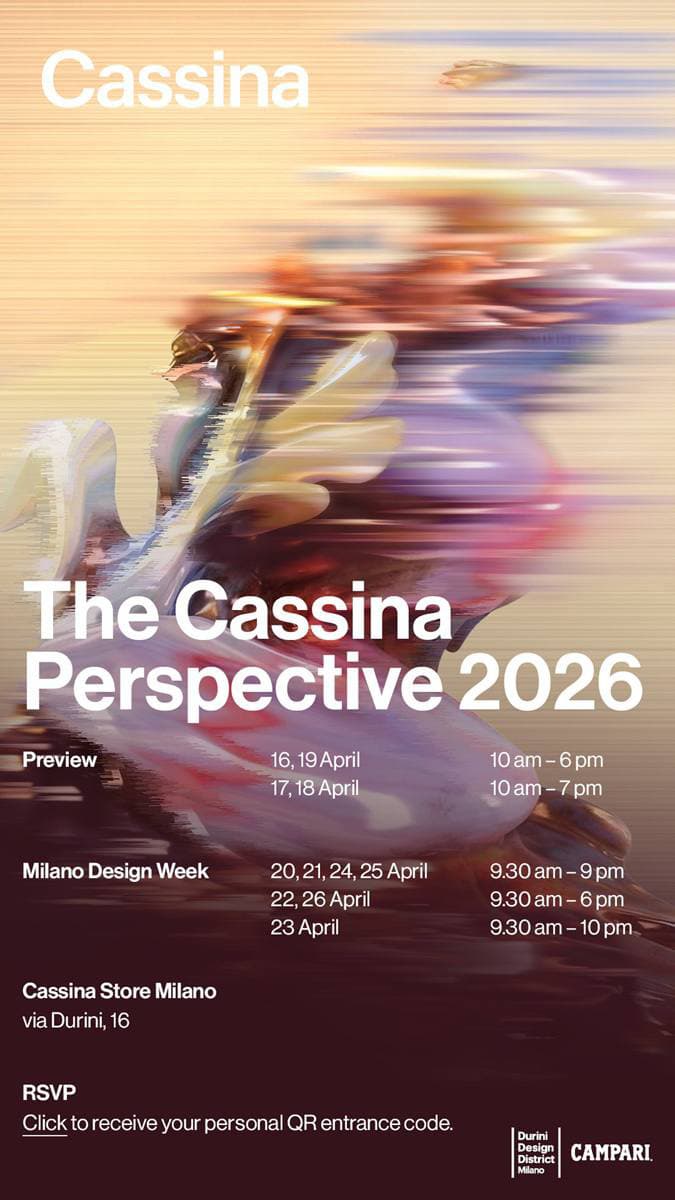 Cassina с 21 по 26 апреля в рамках Milan Design Week 2026 приглашает посетить шоурум по адресу: Via Durini 16, Milan для ознакомления с новинками 2026 года.