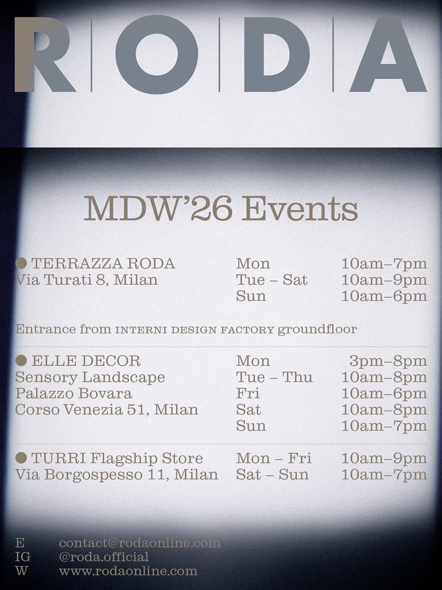Во время Недели дизайна в Милане в 2026 году RODA сыграет ключевую роль в центре дизайнерской жизни Милана, проведя ряд мероприятий по всему городу.